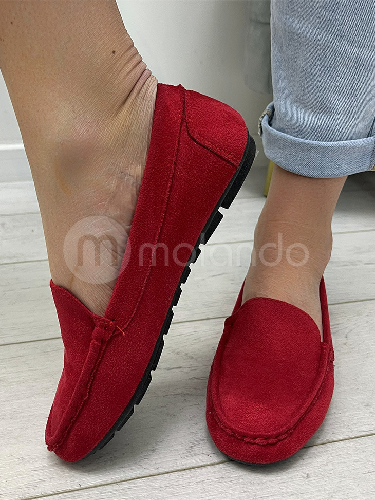 Czerwone mokasyny to fundament garderoby, który łączy w sobie elegancję z wygodą. Prezentowany model wyróżnia się minimalistycznym krojem oraz precyzyjnymi przeszyciami na nosku, co nadaje im klasycznego charakteru. Wykonane z przyjemnego w dotyku materiału imitującego zamsz, świetnie dopasowują się do stopy, zapewniając wygodę podczas długich spacerów czy pracy. Płaska podeszwa gwarantuje stabilność, a wyrazisty kolor ożywi każdą casualową stylizację – od jeansów po dzianinowe sukienki. To uniwersalne obuwie typu wsuwanego, które sprawdzi się w niemal każdej sytuacji.