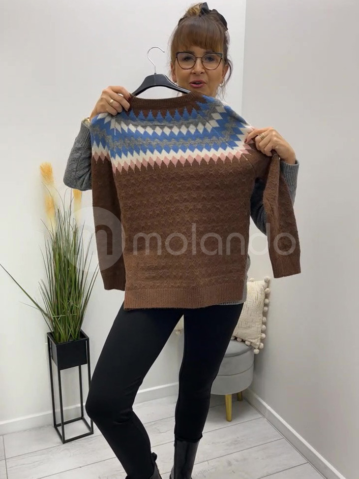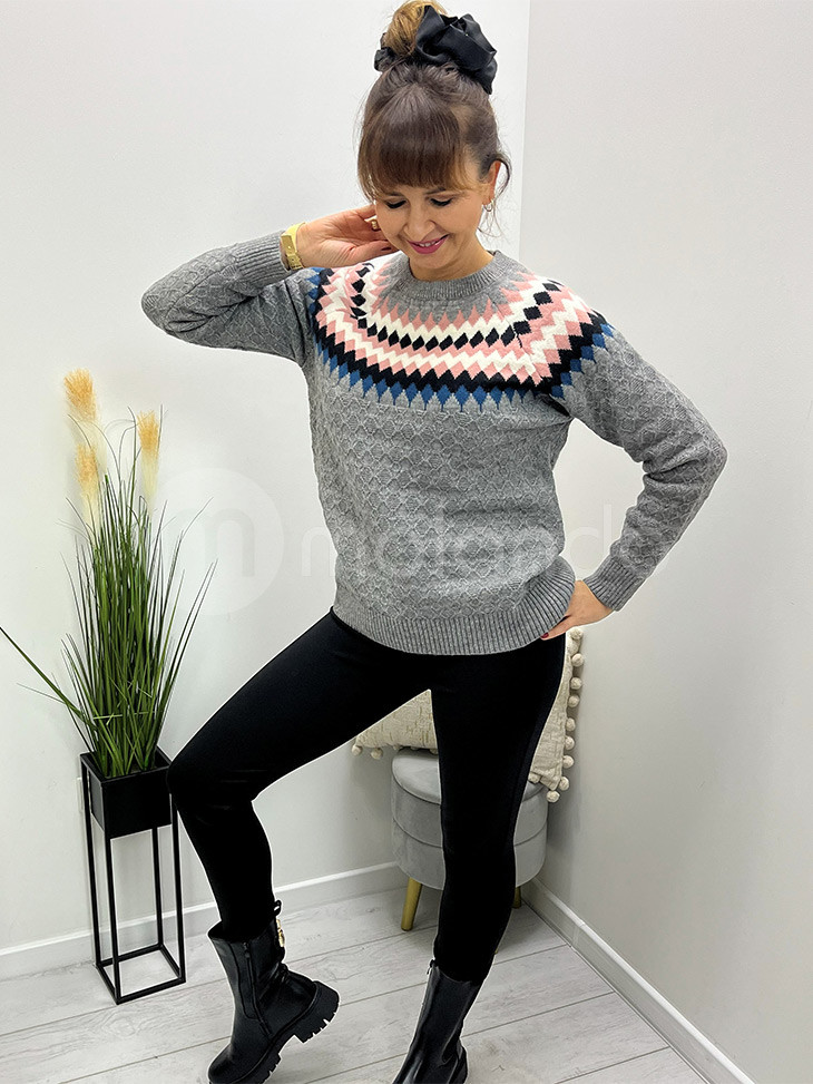 Jego największym atutem jest niezwykle efektowny, kolorowy karczek, ozdobiony geometrycznym wzorem w stylu norweskim (fair isle), który od razu przyciąga wzrok i ożywia całą stylizację. Ta barwna część pięknie kontrastuje z resztą swetra, wykonaną z dzianiny o wyraźnym, strukturalnym splocie. Klasyczny, swobodny krój z okrągłym dekoltem zapewnia komfort i nie krępuje ruchów, a miękka dzianina przyjemnie otula ciało. To idealny sweter do jeansów, legginsów czy sztruksów – stworzy z nimi idealny zestaw na zimowy spacer czy wieczór z kubkiem gorącej herbaty.