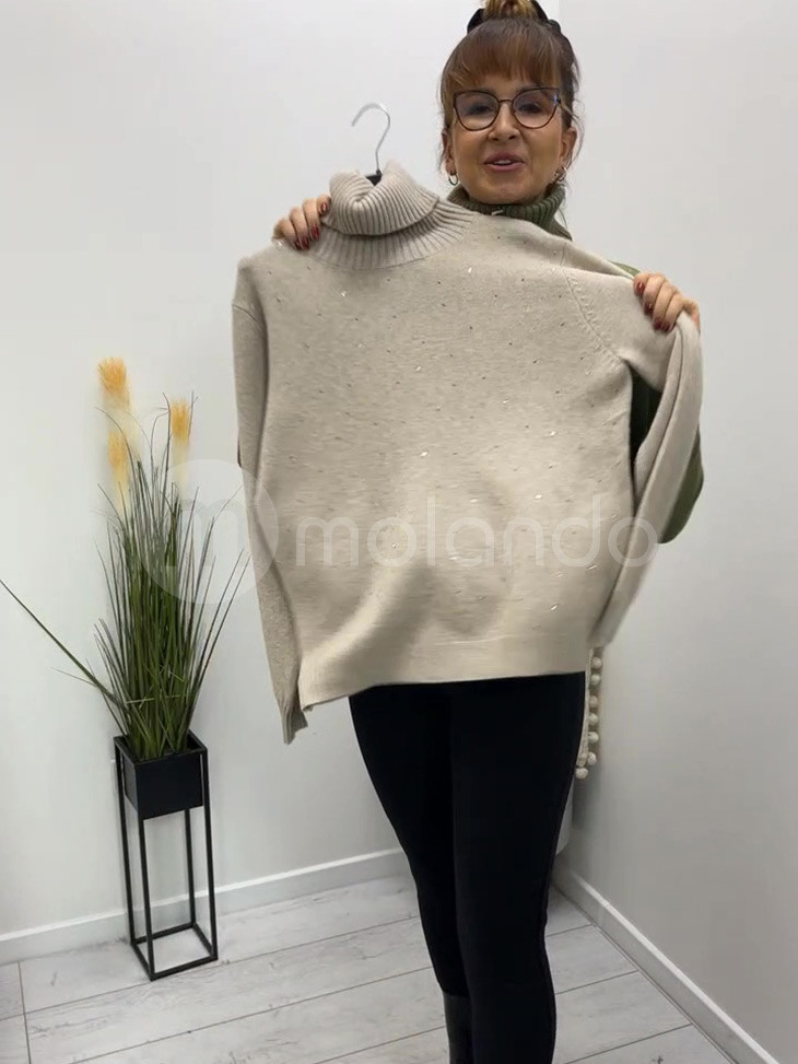 Jego największym atutem jest niezwykle miękka i elastyczna dzianina, która jest tak przyjemna, że nie będziesz chciała go zdejmować. Cały jego urok tkwi w prostocie przełamanej dyskretnym detalem – na całej powierzchni swetra nieregularnie rozmieszczono malutkie, połyskujące kryształki, które pięknie mienią się w świetle, przypominając rozgwieżdżone niebo. Wysoki, otulający golf nie tylko świetnie wygląda, ale także zapewnia dodatkowe ciepło w mroźne dni. To idealna propozycja do biura, na spotkanie z przyjaciółmi czy rodzinną uroczystość.